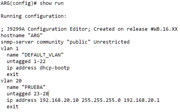 ARG(vlan-20)#: ip address 192.168.20.10(IP) 255.255.255.0(MASK) 192.168.20.1(GW)